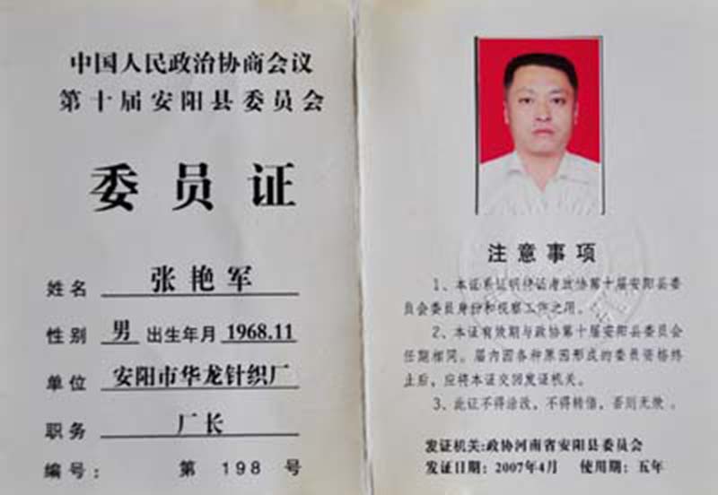 中國人民政治協商會議第十屆安陽縣委員會委員證